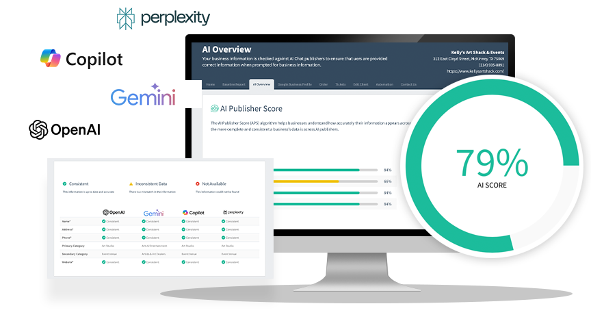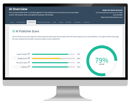Authoritative, trustworthy content and consistent data is more important than ever. Generative AI prioritizes and surfaces trusted, structured sources in its conversational summaries. Want to be found in those results? Our AI Presence Amplifier tool provides agency partners with an AI Publisher Score (APS) as an add-on service. This percentage gives visibility into how AI agents and answer engines see business data as consistent, inconsistent, or missing.