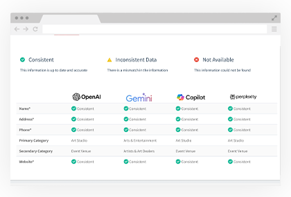 The AI Presence Amplifier reviews business data across seven key attributes to generate the AI Publisher Score. Based on information available at the time of the initial scan, data will be flagged as consistent, inconsistent, or missing. Agency partners can order this add-on service for Advice Local to correct the information manually and via API.